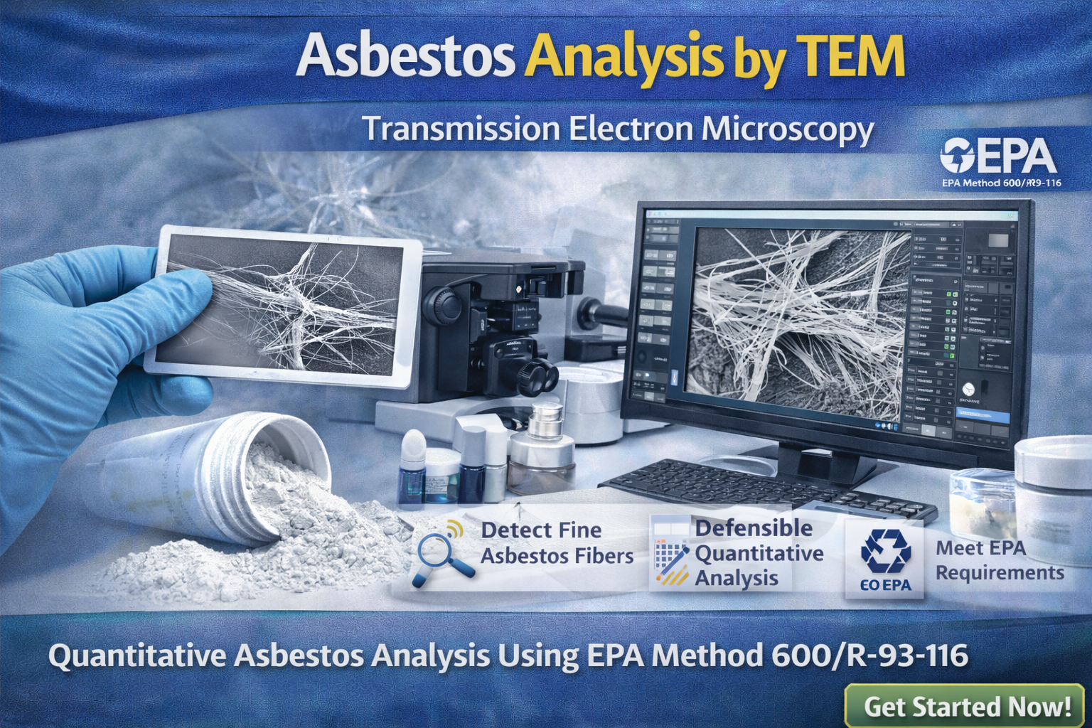 Our Asbestos Analysis by TEM service provides sensitive and reliable identification of asbestos fibers using transmission electron microscopy in accordance with EPA Method 600/R-93-116. This testing helps manufacturers and product owners evaluate asbestos content while meeting regulatory and safety expectations.