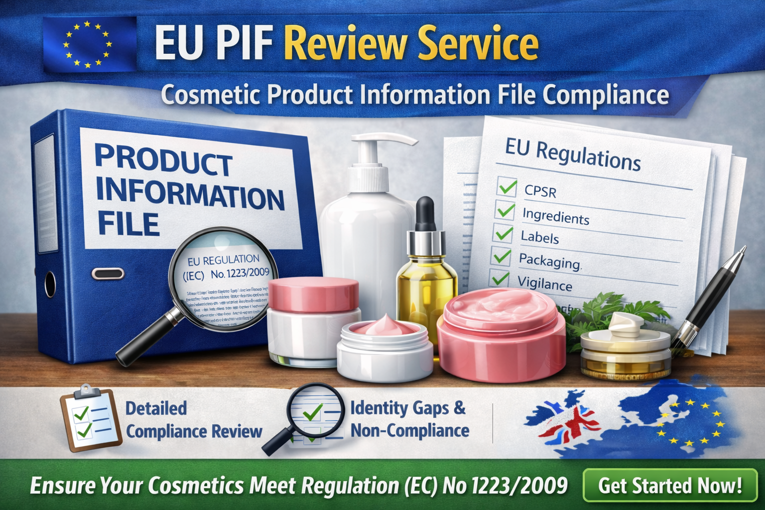 EU PIF Review Service for cosmetic products. An EU-qualified assessor reviews the Product Information File for compliance with Regulation (EC) No. 1223/2009.